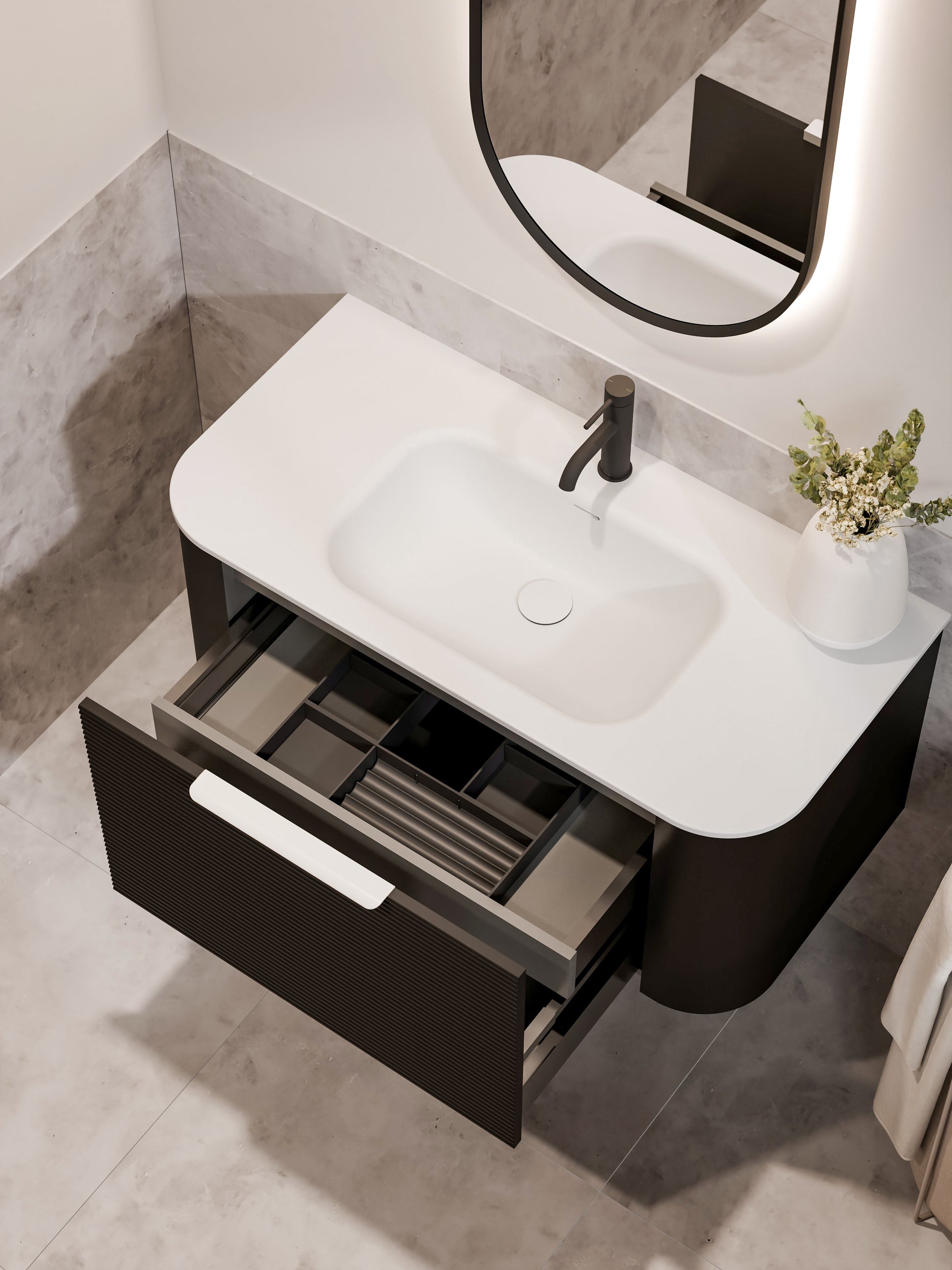 The all-new Curved Nature Vanity brings a touch of modern luxury to your bathroom. Featuring a stunning curved design, this vanity creates a warm and inviting atmosphere. Featuring a fluted vanity front