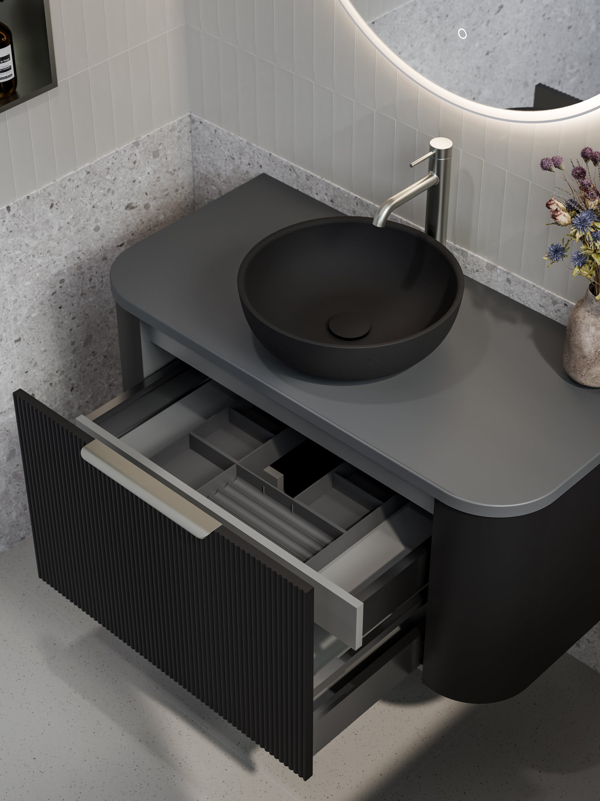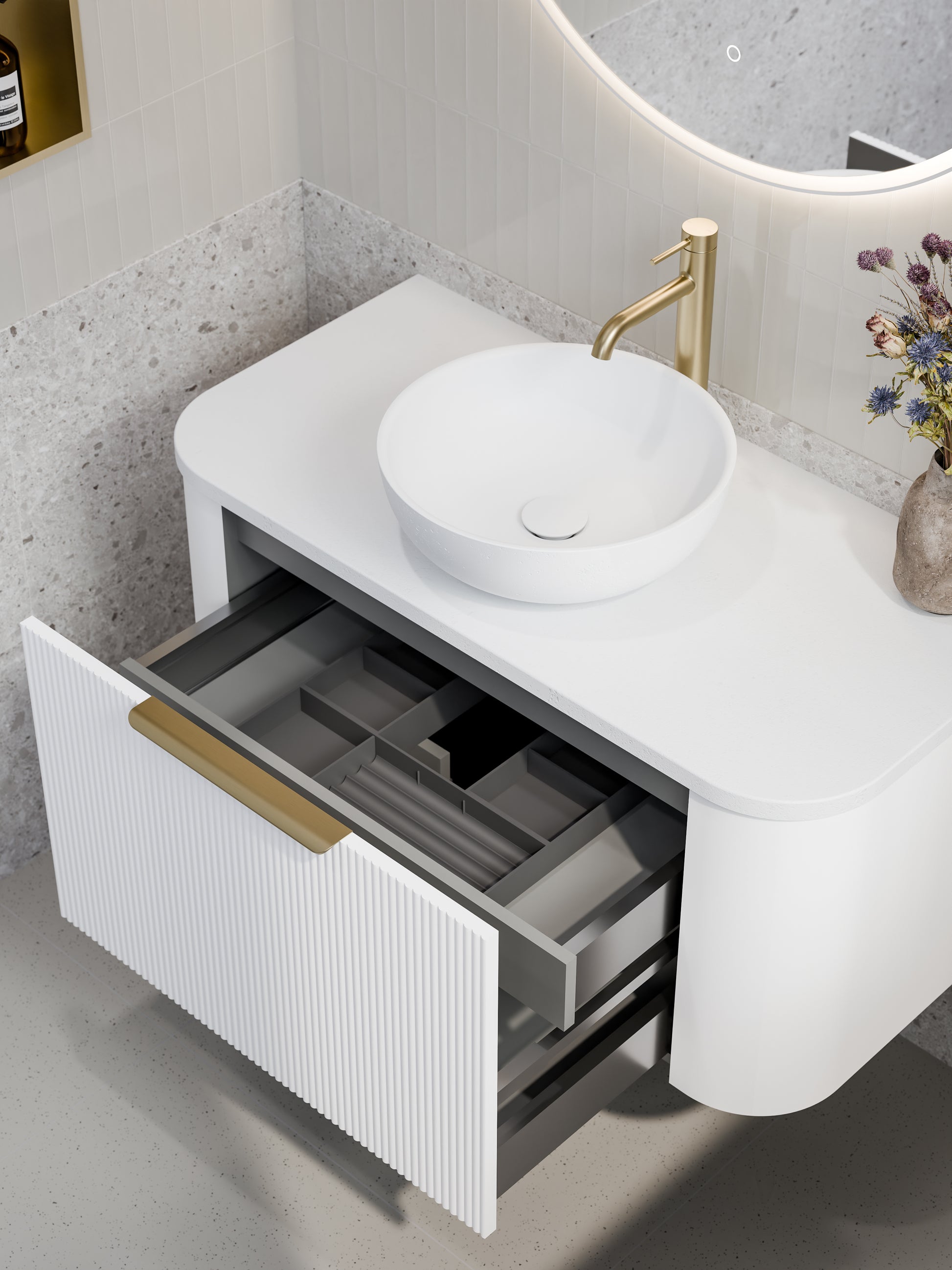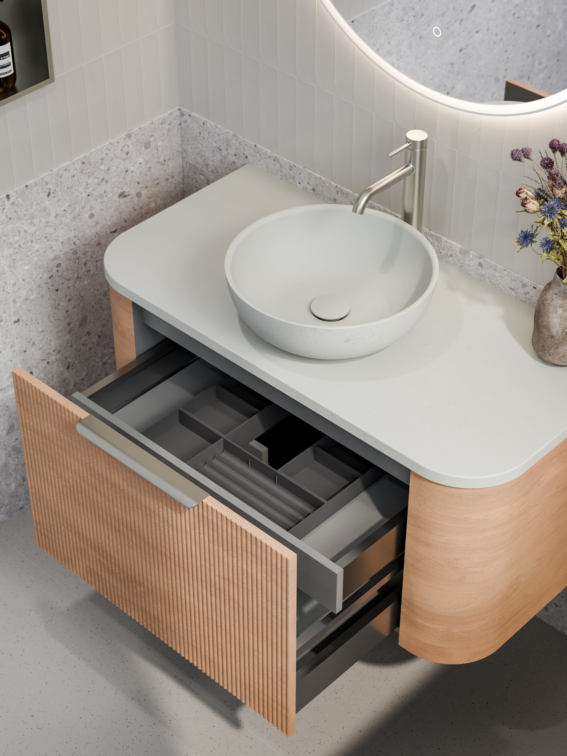 The all-new Curved Nature Vanity brings a touch of modern luxury to your bathroom. Featuring a stunning curved design, this vanity creates a warm and inviting atmosphere. Featuring a fluted vanity front