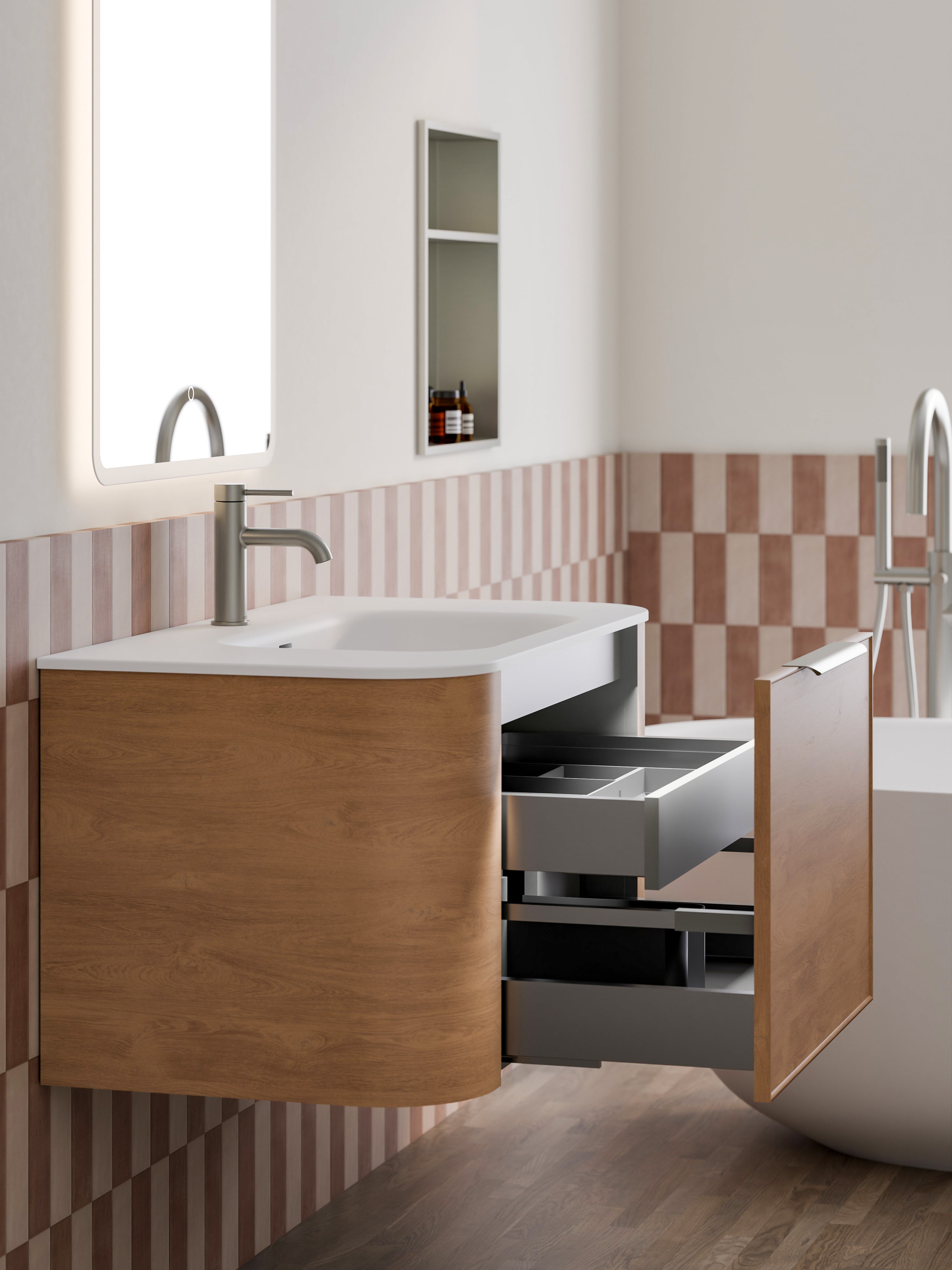 The new Curved Nature Vanity adds a sense of contemporary elegance to your bathroom. Boasting a beautiful curved design, this vanity evokes a cozy and welcoming ambiance. With a Bordered front.